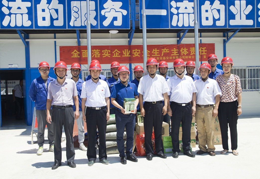 炎炎夏日送清涼,絲絲關愛寄深情。為確保基層一線職工安全度夏,7月21日上午,集團公司黨委副書記牛曙東冒著高溫酷暑,在黨委工作部主任徐文聯,安徽安裝公司董事長、總經理王軍邦,紀委書記、工會主席李寬旭的陪同下,到安徽安裝公司蚌埠卷煙廠項目,為堅守在高溫下工作一線的干部員工送去了“清涼”和集團黨委親切的慰問,同時還為黨員干部、入黨積極分子上了一堂別開生面的黨課。