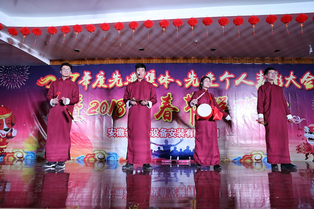 整場聯歡會由音歌快板、情景劇、小品、詩朗誦、舞蹈、才藝表演、女聲獨唱等12個節目組成,均為職工自編自導自演。伴隨著悅耳動聽的音歌快板表演《企業興旺我自豪》,聯歡會正式拉開序幕。情景劇《我驕傲 我是省安人》,反映了安徽安裝人用勤勞和汗水,創造了一個個值得驕傲的碩果;詩朗誦《風雨同行 以心筑夢》,展現了安徽安裝人不斷開拓新市場,實現新突破的壯麗征程;舞蹈《精忠報國》,傳遞了安徽安裝人激昂豪邁,強烈愛國主義的情懷;情景劇《擼起袖子加油干》,表達了安徽安裝人不忘初心,團結一致砥礪奮進的決心;男生合唱《明天會更好》,抒發了全體安徽安裝兒女同心同德,共筑企業燦爛明天的美好心愿,歡快的音符,優美的旋律,振奮的歌詞,贏得了現場觀眾的歡呼喝彩與陣陣掌聲,將現場的氣氛推向高潮。演出過程中還穿插了抽獎和游戲環節。