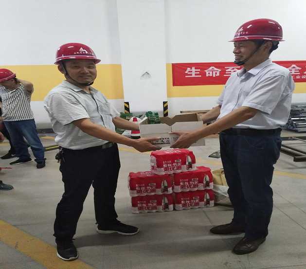 7月23日,第一分公司黨支部書記胡迎東、分管生產副經理魯會、分管安全副經理李多德、一分公司工會副主席鄭佳及相關部門負責人來到省行政中心提升改造項目部,為現場員工發放了茶葉、礦泉水、花露水等防暑降溫物品,把清涼送到了施工一線,把關懷送到員工心中!大家紛紛表示:雖然在屋頂露天施工酷熱難耐,但有分公司領導的關懷,一定能克服高溫環境帶來的困難,堅守崗位,苦干實干,保質保量地按時完成施工任務。