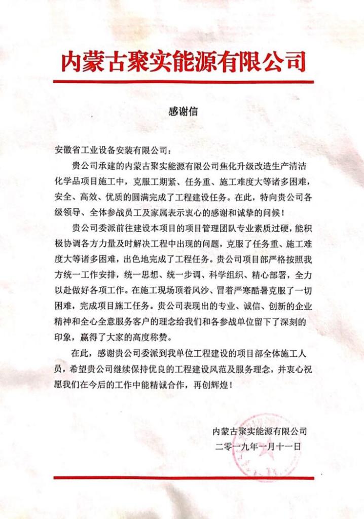2019年1月14日,安徽安裝承建的內蒙古聚實能源有限公司焦化升級改造生產清潔化學品項目,克服工期緊、任務重、施工難度大等諸多困難,安全、高效、優質的圓滿完成了工程建設任務。業主內蒙古聚實能源公司總經理張春軍向公司贈送內容為“力克萬難 保中交節點;眾志成城 創優質履約”的錦旗。