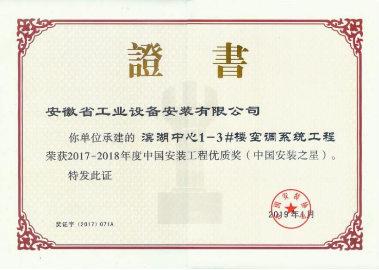 2019年4月17日,中國安裝協(xié)會(huì)在珠海召開第六屆七次理事(擴(kuò)大)會(huì)議暨工程創(chuàng)優(yōu)經(jīng)驗(yàn)交流會(huì),會(huì)上表彰了2017-2018年度中國安裝工程優(yōu)質(zhì)獎(jiǎng)(中國安裝之星),安徽安裝承建的“合肥市濱湖中心1#-3#樓空調(diào)系統(tǒng)工程”項(xiàng)目榮獲該項(xiàng)榮譽(yù)。