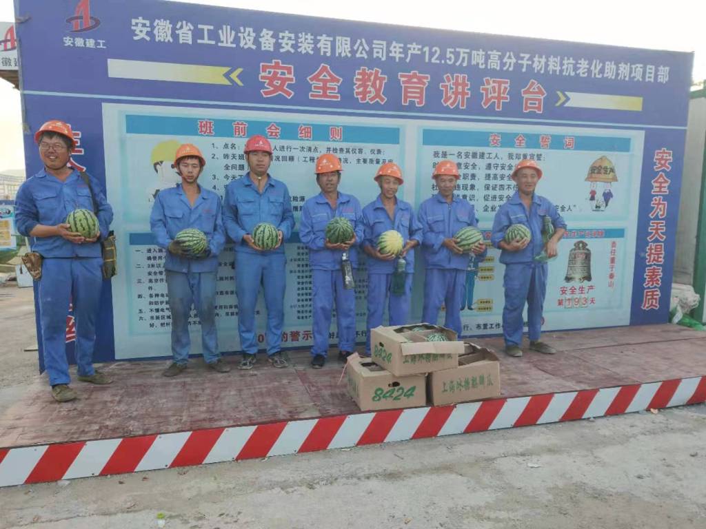 珠海連日高溫,氣候炎熱,為確保勞動者安全、健康生產工作,響應公司“送清涼”活動安排,利安隆(珠海)新材料有限公司年產12.5萬噸高分子材料抗老化助劑項目一期工程項目部積極開展了送清涼活動,為施工現場汗流浹背的工人們購買了西瓜、純凈水、藿香正氣水、人丹、十滴水等防暑降溫物品。