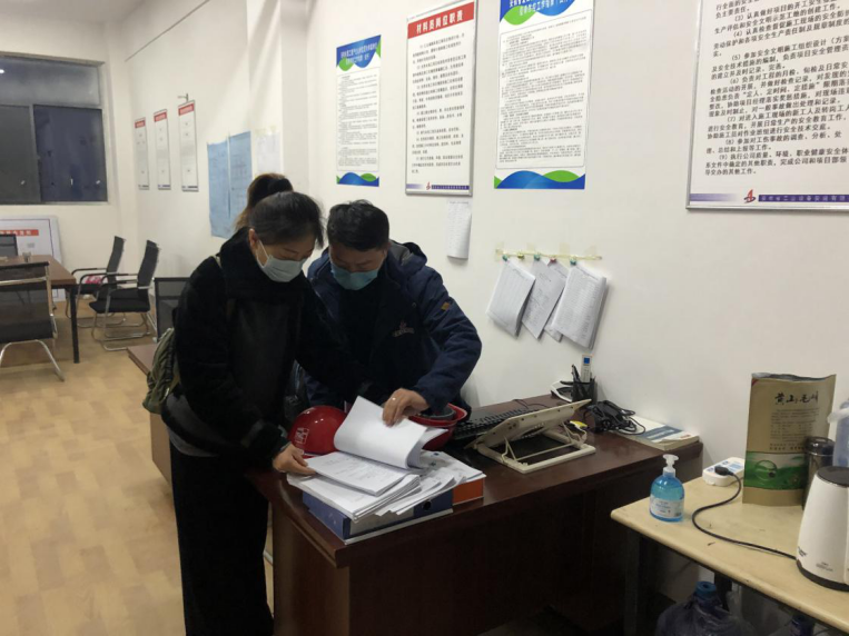 來到施工現場,檢查組一行首先查看了防疫物資儲備情況、返崗勞務作業人員進出工地人員排查隔離情況,現場衛生消毒、清潔打掃、體溫檢測、勞動防護進場等,接著實地查看了工程的施工進展情況。