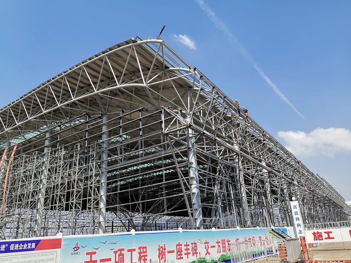 蚌埠水利科學研究院淮河試驗研究中心一期工程主要施工內容為新建水工河工模型試驗鋼結構及附屬土建工程,建筑面積約20000㎡,結構形式為排架柱(圓鋼管)+三肢管桁架結構,構件高度24米,跨度97.6米(單跨跨度為48.8米),抗震設防烈度為7度,9000多根鋼管,用量1800多噸,目前安徽省建設第二大跨度的鋼結構工程,是安徽安裝公司承接的最大高跨、最大規模、最大施工難度、最具技術含量的大型安裝項目。