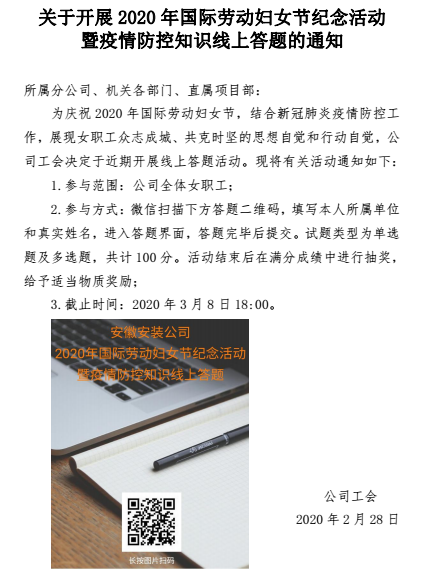 鑒于當前新冠肺炎疫情防控特殊時期,本著不聚集、少聚集的原則,安徽安裝公司工會組織全公司八十多名女職工參加了疫情防控和《婦女權益保障法》等知識的學習,利用微信平臺開展了線上答題活動,活動一推出,廣大女職工立即響應,熱情高漲,對于不太清楚的問題,主動查閱相關資料,與身邊的同事討論,對模棱兩可的問題,仔細斟酌精確作答。通過此次答題活動,全公司范圍內再一次掀起宣傳疫情防控常識的熱潮,推動公司疫情防控工作的開展,也進一步普及了新時期下女職工的合法權益。答題活動結束后,對優秀成績給予獎勵。