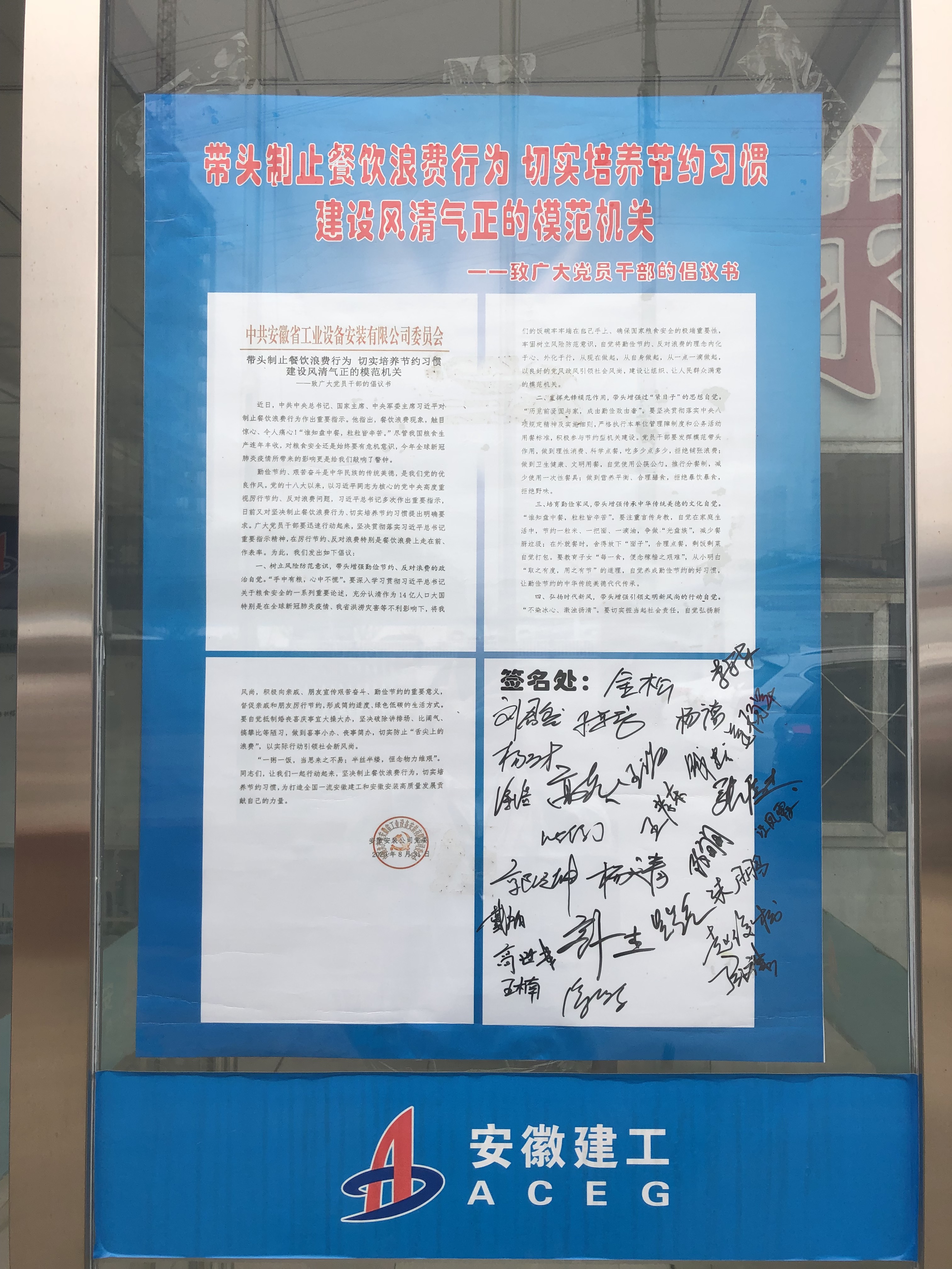 會(huì)后,全體項(xiàng)目部職工在制止餐飲浪費(fèi)行為切實(shí)培養(yǎng)節(jié)約習(xí)慣的倡議書(shū)上紛紛簽名承諾。