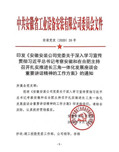 一是公司黨委迅速嚴密部署學習宣傳貫徹各項工作。9月8日,公司黨委理論中心組率先帶頭,認真學習重要講話精神,深刻交流研討。9月14日,安徽安裝公司黨委下發(fā)《關(guān)于深入學習宣傳貫徹習近平總書記考察安徽和在合肥主持召開扎實推進長三角一體化發(fā)展座談會重要講話精神的工作方案》,結(jié)合公司實際,精心嚴密部署“大學習”“大宣傳”“大貫徹”和“大落實”工作,確保公司上下人人都學習,人人都領(lǐng)會。