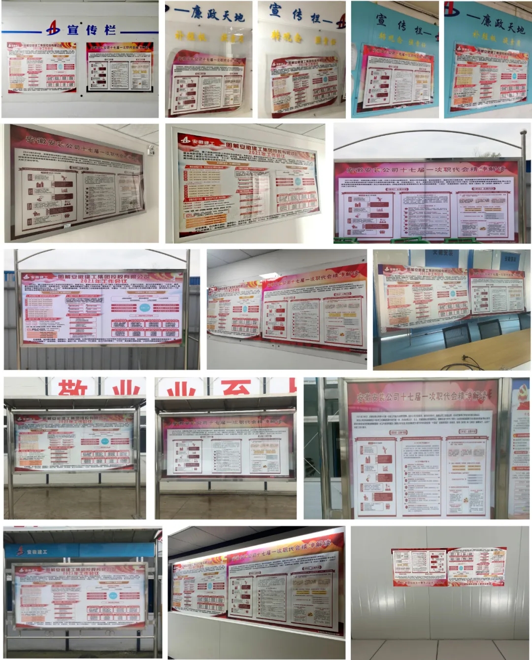 二是順勢推進、以點帶面,采取各種方式營造濃厚學習氛圍。在兩級會議召開以后,公司黨委辦公室第一時間編印宣傳欄及圖解,并及時發(fā)布在微信公眾號,廣泛宣傳,讓集團工作會議和公司職代會精神人人皆知、入腦入心,進一步凝聚共識、形成合力,夯實思想基礎。年后復工,立即組織各黨支部在機關及項目部懸掛張貼宣傳圖、發(fā)放宣傳手冊,掀起學習熱潮,營造濃厚氛圍,通過宣傳主陣地形成輿論“正能量”。