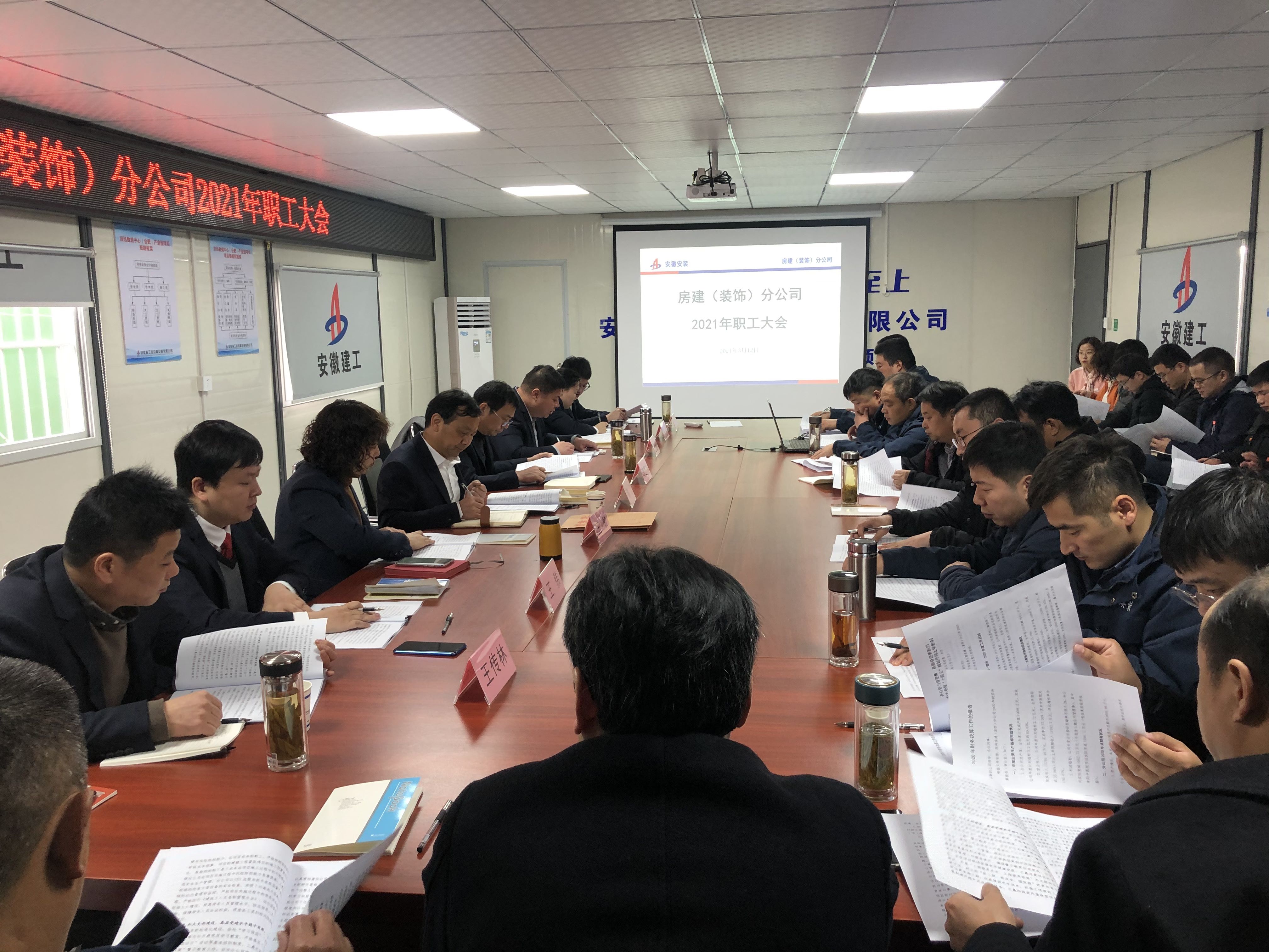 仲春時節,春風和煦,杏花飄香。3月12日上午,房建(裝飾)分公司在合肥勝利召開2021年度職工大會。分公司全體職工參加了大會,公司副總經理高飛,紀委書記、工會主席李寬旭,人力資源部及黨委辦公室主要負責同志應邀出席會議。