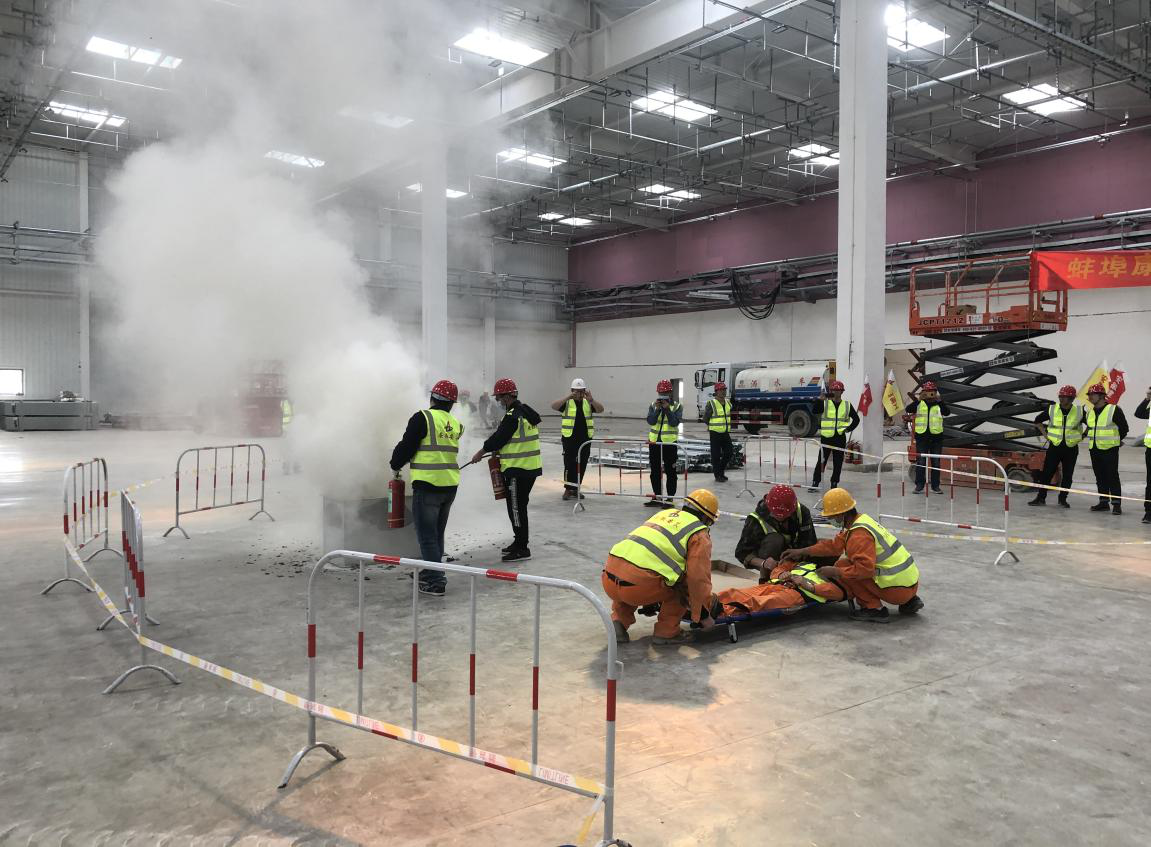 為了建立健全生產安全事故綜合應急救援機制,提升應急處置能力,切實落實“安全第一、預防為主、綜合治理”的安全生產工作方針和“預防為主、防消結合”的消防工作方針。2021年4月28日下午,安徽安裝公司在康寧藥用硼硅玻璃管廠房設施建設工程項目開展了安全事故應急救援演練。公司副總經理高飛應邀出席本次此次演練活動,公司相關部門負責同志、所屬各分公司代表、康寧項目部全體員工參加。
