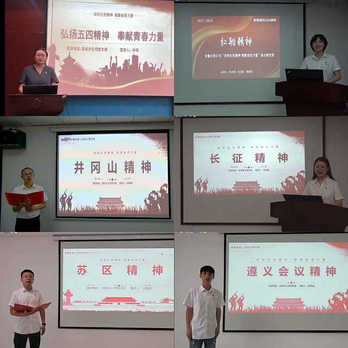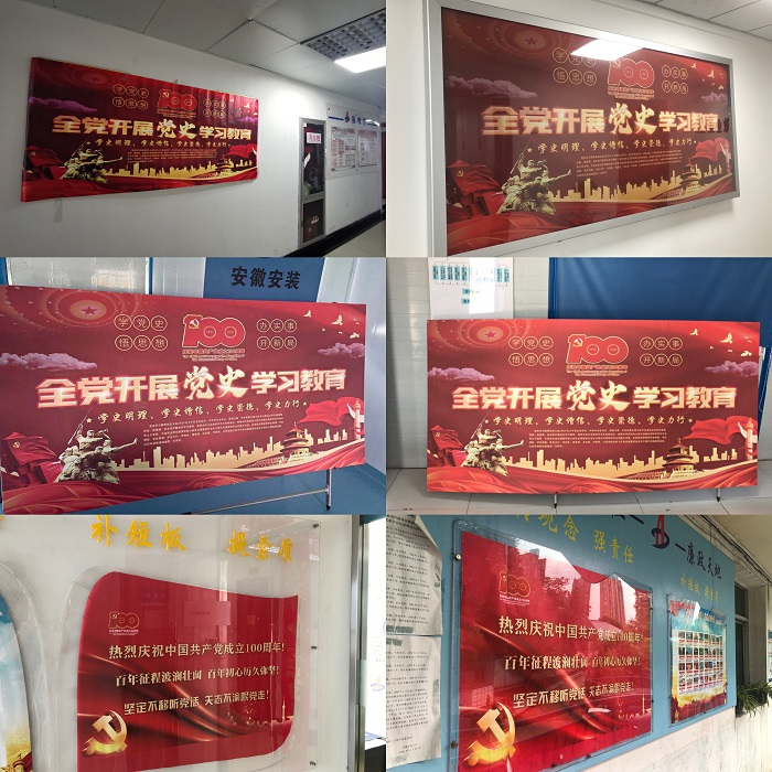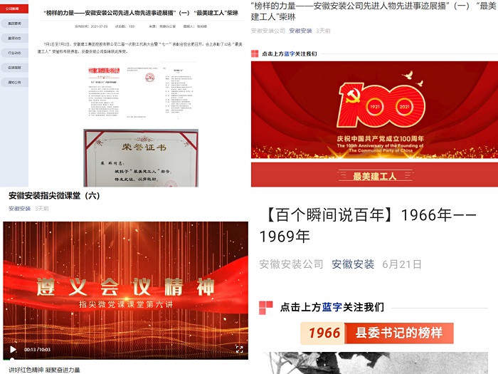 公司黨委第一時間編印專刊宣傳板報下發(fā)至所屬各單位和基層項目一線,用好企業(yè)網(wǎng)站、微信公眾號、電子屏、宣傳欄和所屬各單位、各項目部所有宣傳陣地,在公司網(wǎng)站、微信公眾號先后開設(shè)“百個瞬間說百年”“黨史學習教育專欄系列報道”“榜樣的力量——安徽安裝公司先進人物先進事跡展播”“記錄奮進力量—安徽安裝公司基層一線事跡展播”等專欄進行專題宣傳,大力營造“學習黨史有熱情,干事創(chuàng)業(yè)有激情”的良好氛圍,合肥分公司黨支部舉辦黨史學習教育主題攝影大賽,努力營造悟初心、守初心、踐初心的強大聲勢。