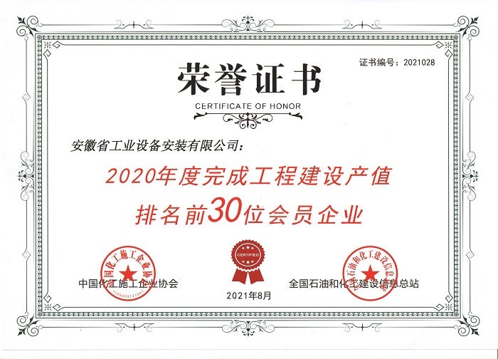 安徽省工業設備安裝有限公司榮膺中國 化工施工企業協會2020年度工程建設 產值排名前30位會員企業