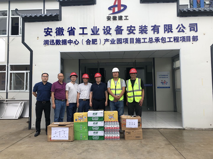 烈日炎炎,酷暑難當,6月16日,房建(裝飾)分公司黨支部書記王偉攜分公司工程管理部來到潤迅數(shù)據(jù)中心(合肥)產(chǎn)業(yè)園項目,看望和慰問奮戰(zhàn)在一線的員工,為他們送去仁丹、藿香正氣口服液、十滴水、飲料、藥品等防暑降溫物品,實地察看了項目工地和職工生活區(qū),并與項目同志進行了座談交流。