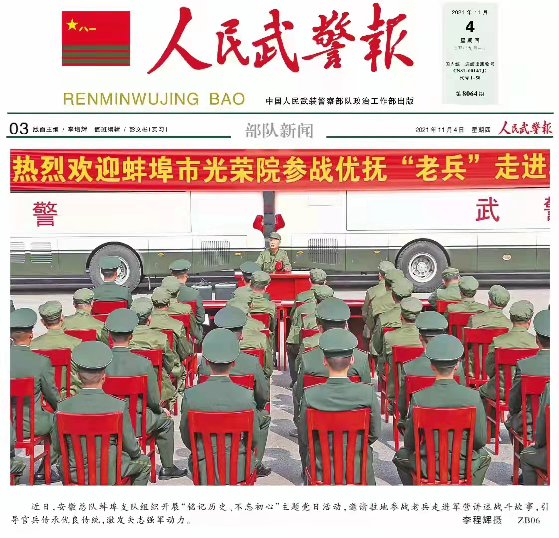 近日,《中國軍視網》《人民武警報》專題報道安徽安裝蚌埠分公司年飛同志作為參戰(zhàn)退伍老兵講授專題黨課。