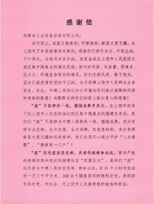 全力抗疫援建 暖心行動獲贊——安徽安裝再收感謝信
