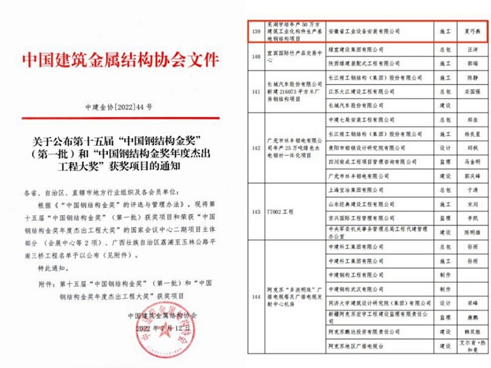 7月12日,中國(guó)建筑金屬結(jié)構(gòu)協(xié)會(huì)公布第十五屆“中國(guó)鋼結(jié)構(gòu)金獎(jiǎng)”(第一批)獲獎(jiǎng)項(xiàng)目。由安徽安裝公司承建的蕪湖宇培年產(chǎn)50萬(wàn)方建筑工業(yè)化構(gòu)件生產(chǎn)基地鋼結(jié)構(gòu)項(xiàng)目獲此殊榮。