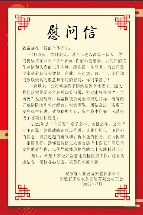 為做好高溫季節勞動保護和防暑降溫工作,保障高溫天氣始終堅持在一線崗位員工的身體健康。7月-8月,安徽安裝公司工會結合職工代表巡察,到分公司在建項目開展“送清涼”活動,親切慰問施工一線員工,并為他們送去清涼和關愛。