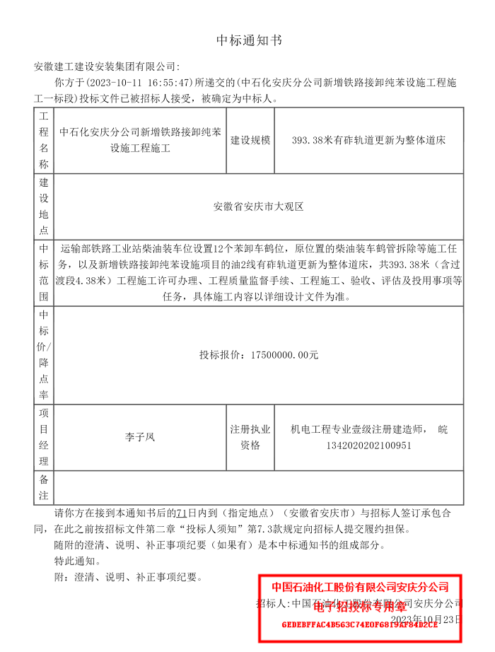 該項目擬對中石化安慶分公司運輸部鐵路工業站柴油裝車位設置12個苯卸車鶴位,以及新增鐵路接卸純苯設施項目的油2線有砟軌道更新為整體道床,共 393.38 米,計劃工期為71天。此次中標是2023年以來分公司繼化工園區儲運部六罐區重大安全風險消減治理項目以及2023年5月-2025年4月工程建設項目施工總承包框架協議項目兩個項目中標后,連續在中石化安慶分公司中標的第三個項目,也是分公司中標的首個鐵路整體道床施工項目。