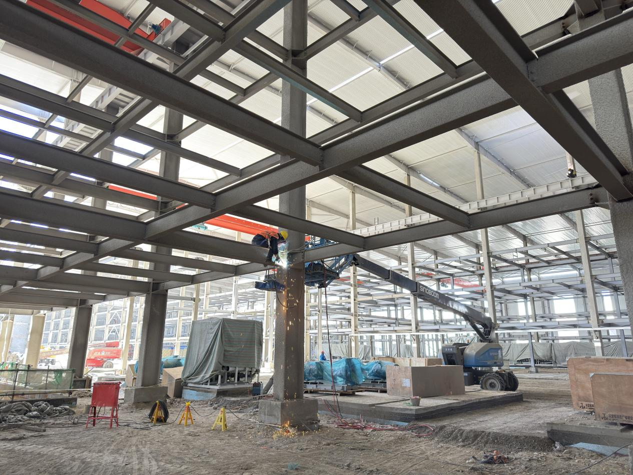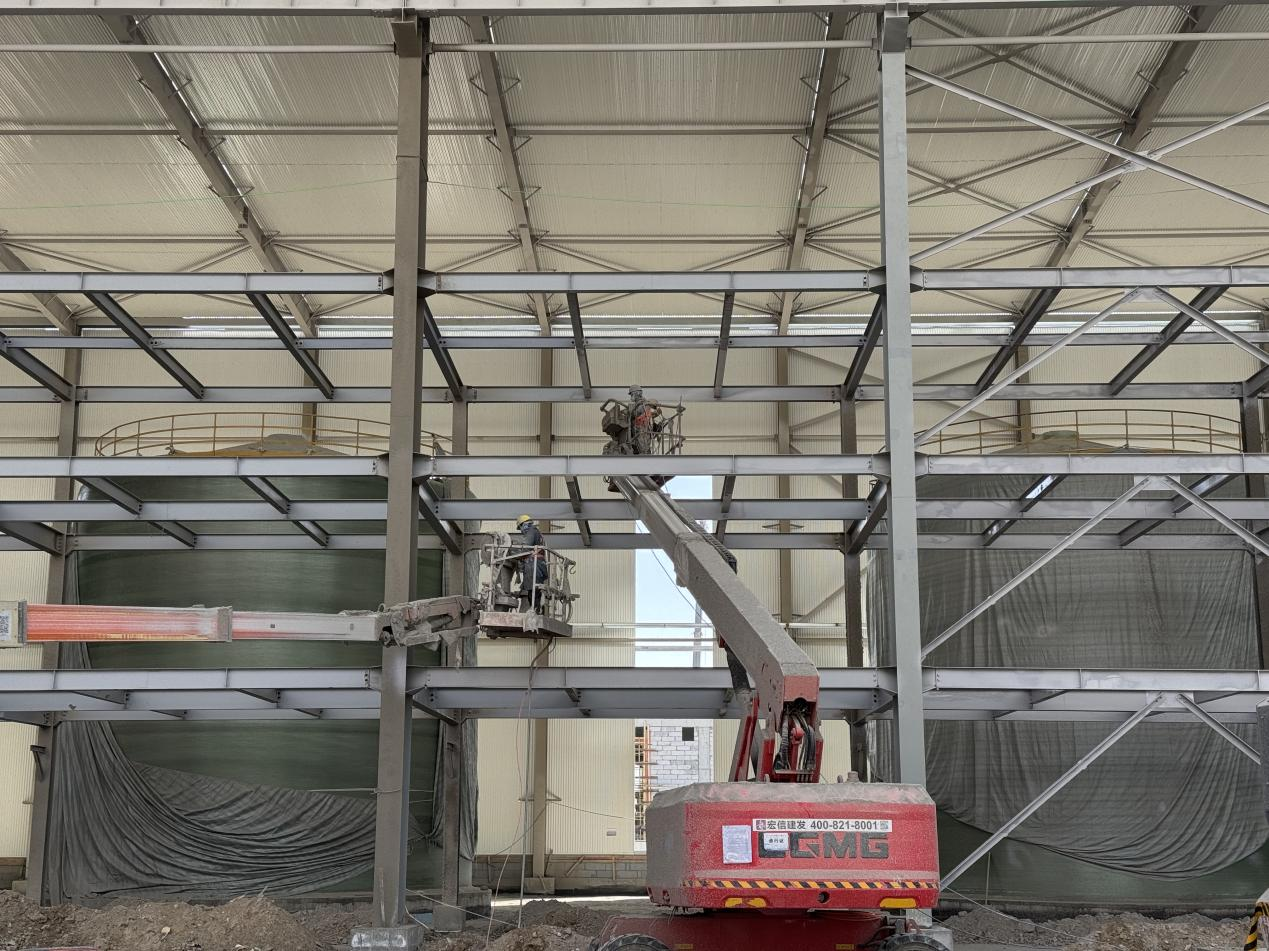 項目地處高海拔鹽湖區(qū),缺氧且淡水匱乏,施工環(huán)境惡劣,資源保障困難。面對不利因素,項目團(tuán)隊迎難而上,積極尋找解決方案,為項目順利推進(jìn)筑牢基礎(chǔ)。截至目前,項目已取得顯著階段性成果,廠房主鋼構(gòu)全部完成,管廊鋼結(jié)構(gòu)完成約95%,防火涂料完成80%,屋面及墻面圍護(hù)結(jié)構(gòu)完成約50%,配電房裝飾裝修工作有序進(jìn)行,各項任務(wù)按計劃穩(wěn)步推進(jìn)。